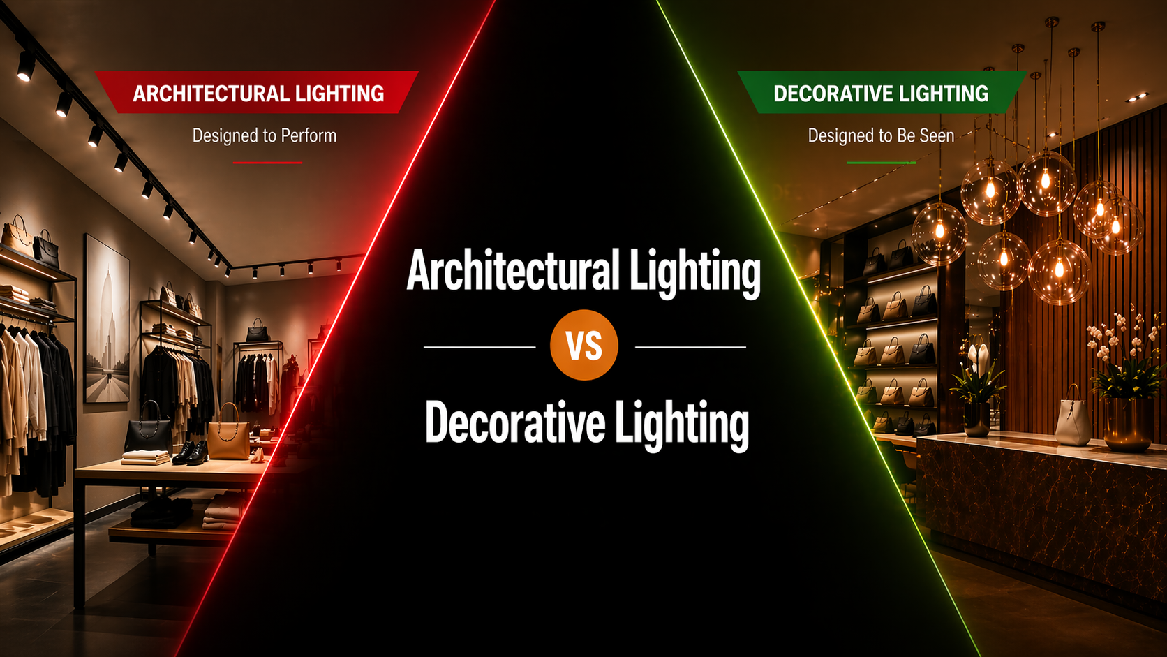 Architectural lighting focuses on functionality — it helps illuminate spaces, highlight products, and improve visibility. Decorative lighting, on the other hand, is more about aesthetics, adding style, mood, and visual appeal to a space.