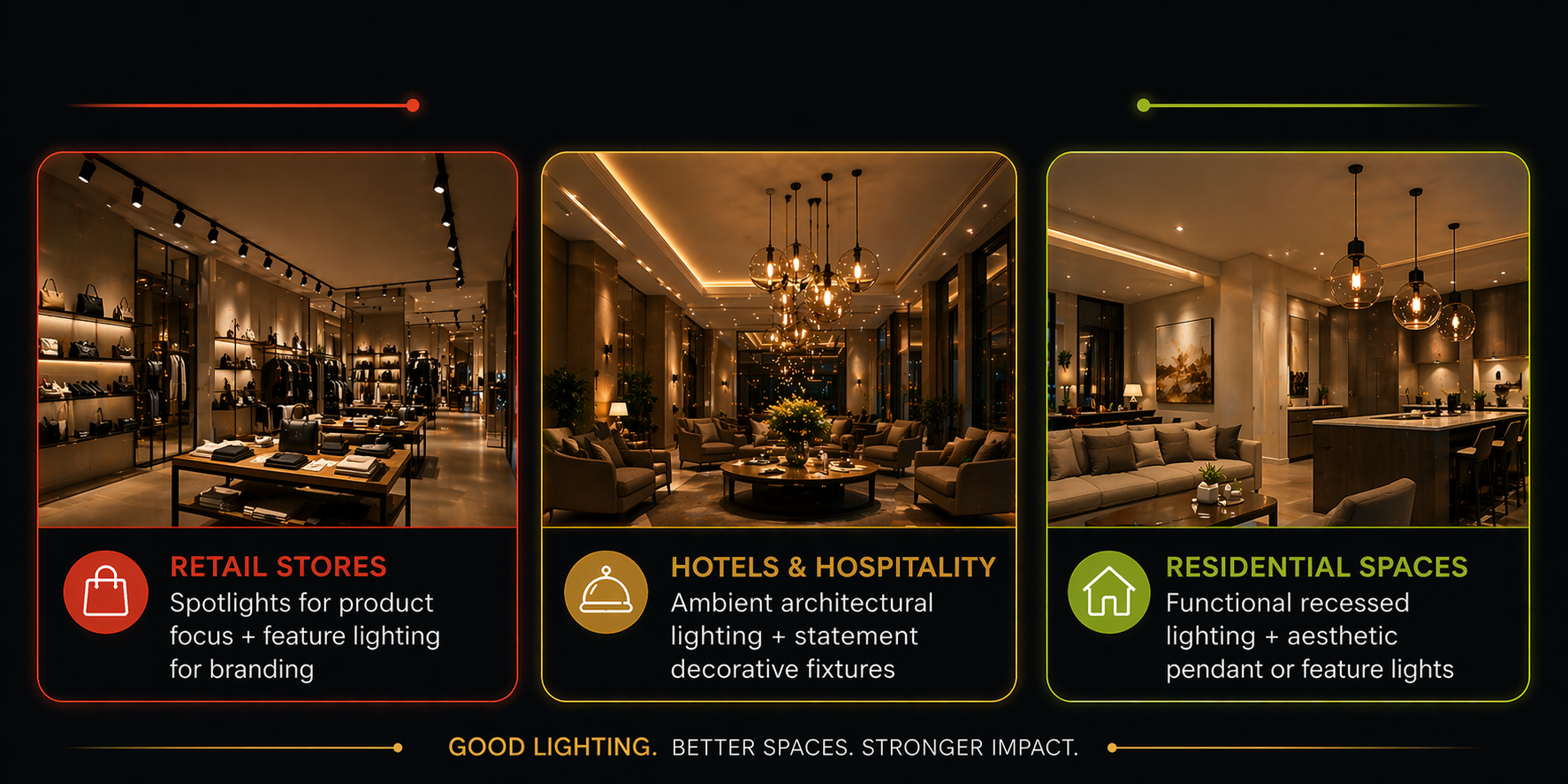 In today’s design-driven spaces, lighting is no longer just about illumination — it’s about experience. Whether it’s a retail showroom, a hotel lobby, or even a modern home, lighting directly influences how people see, feel, and interact with a space.
