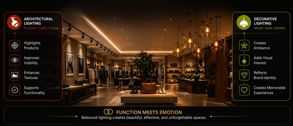 Both are equally important. Architectural lighting ensures products are clearly visible and well-presented, while decorative lighting enhances the overall shopping experience and brand perception.