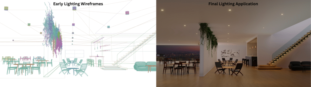 Lighting wireframes act as a common visual reference for architects, lighting designers, and MEP consultants. They make it easier to align lighting layouts with structural and electrical systems early in the process. This reduces coordination issues and streamlines decision-making across teams.